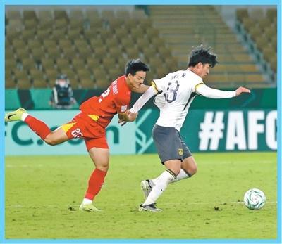 U23男足亚洲杯半决赛,中国队球员拜合拉木(左)在积极拼抢。 吴志钊摄(影像中国)